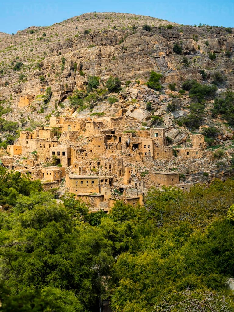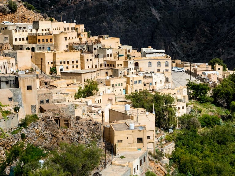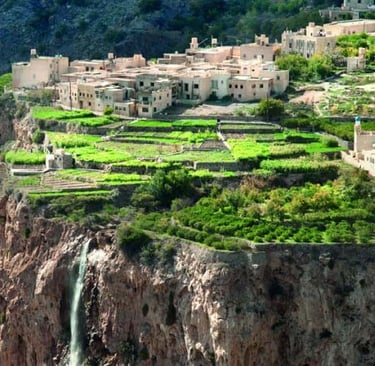 یکی از جذابترین مناظر، روستاهای پلکانی مانند سیق، عل Ayn و قریه الشریحی است که باغهای انار، هلو، زردآلو و گل رز در دامنه کوه شکل گرفتهاند. سیستم آبیاری سنتی (فلج) همچنان فعال است و سبک زندگی محلی در این مناطق حفظ شده است.